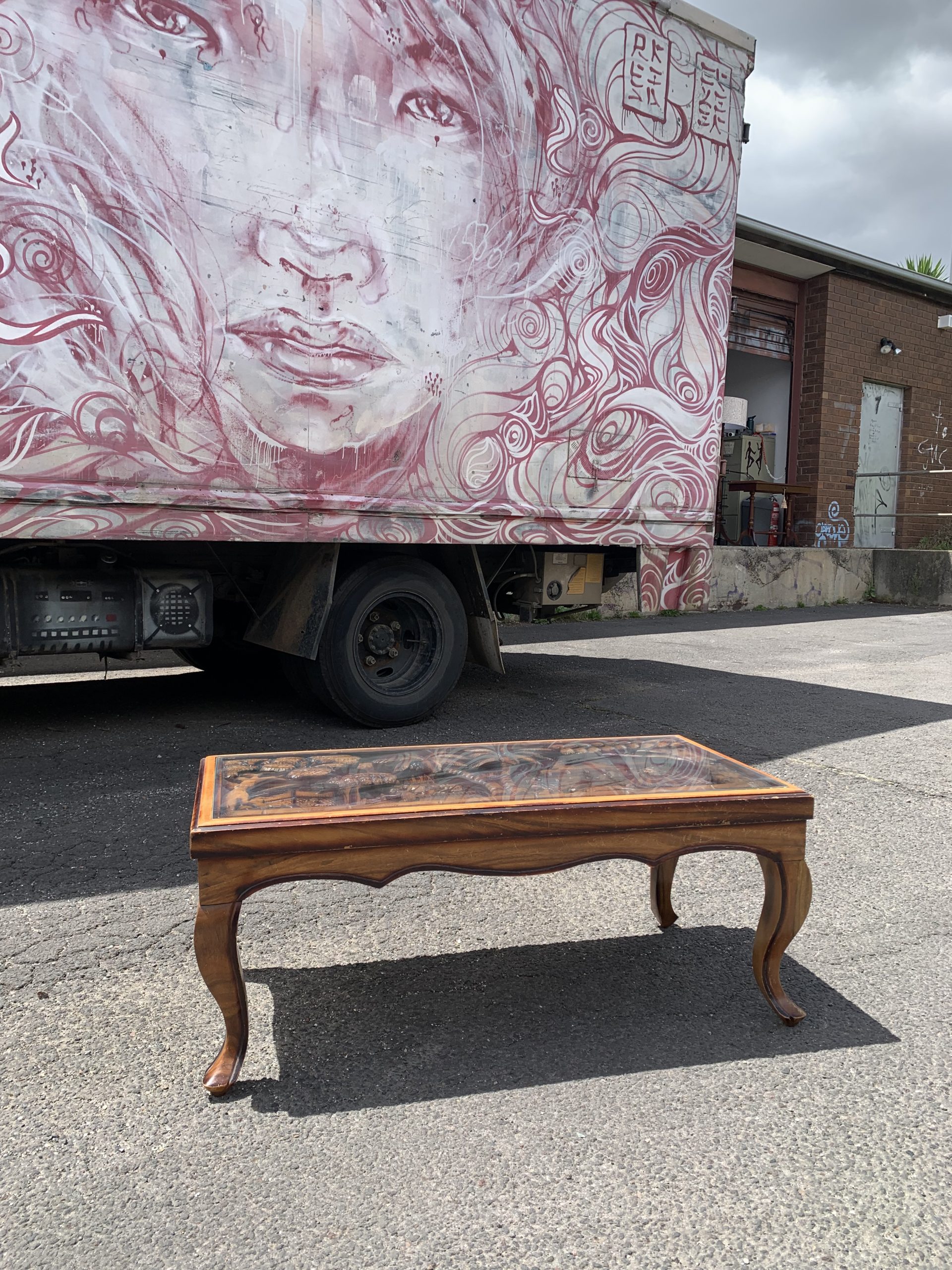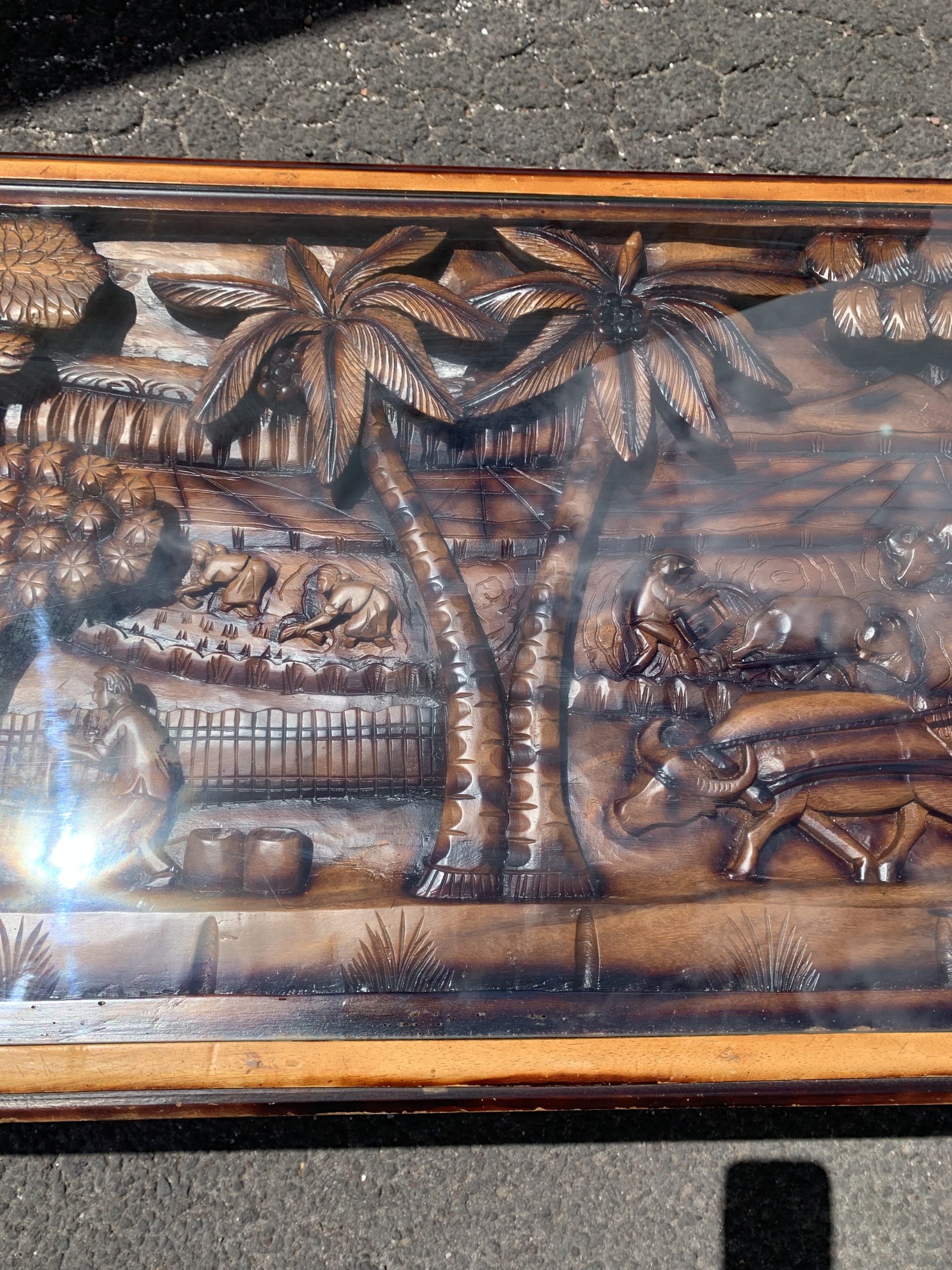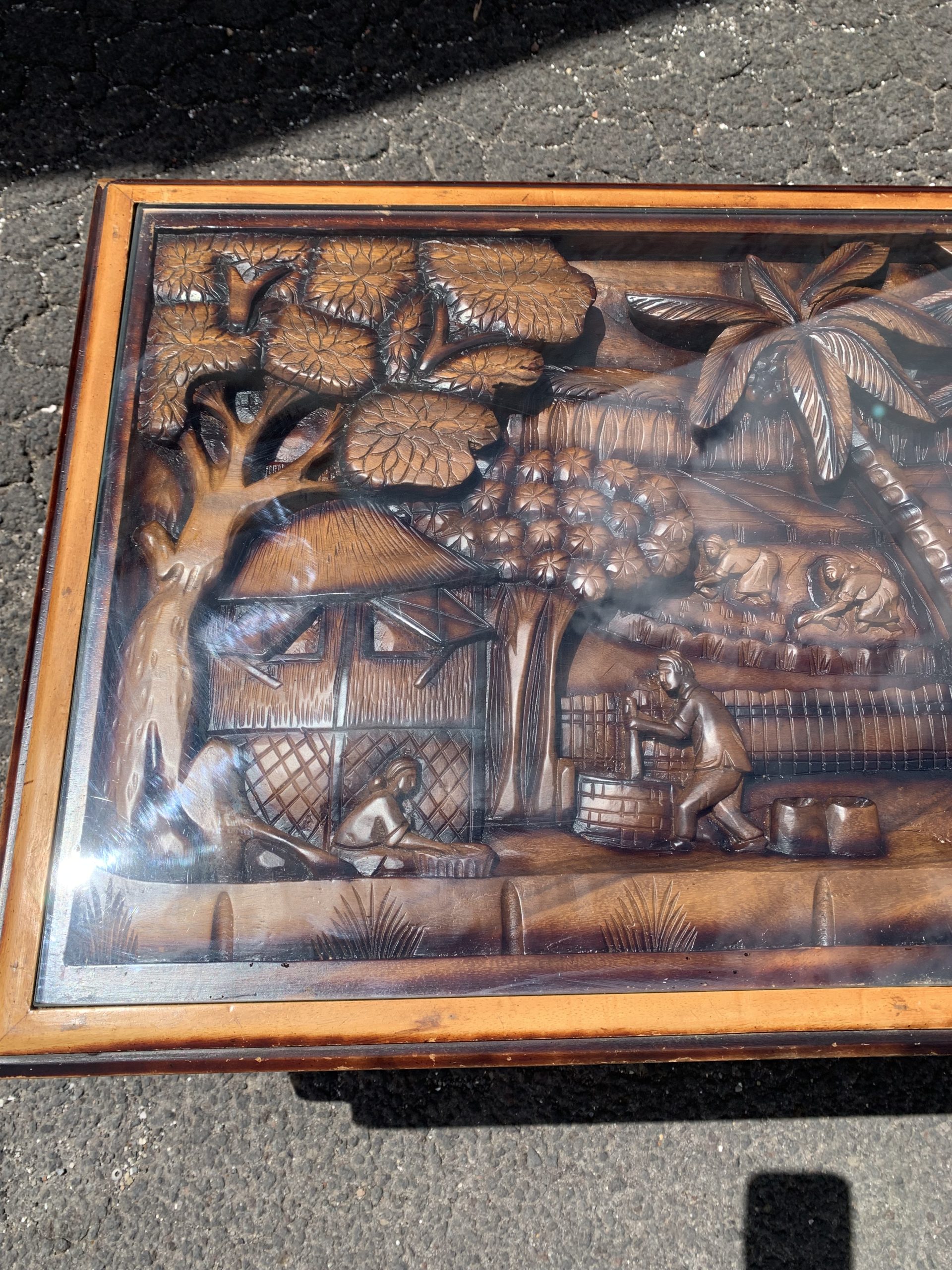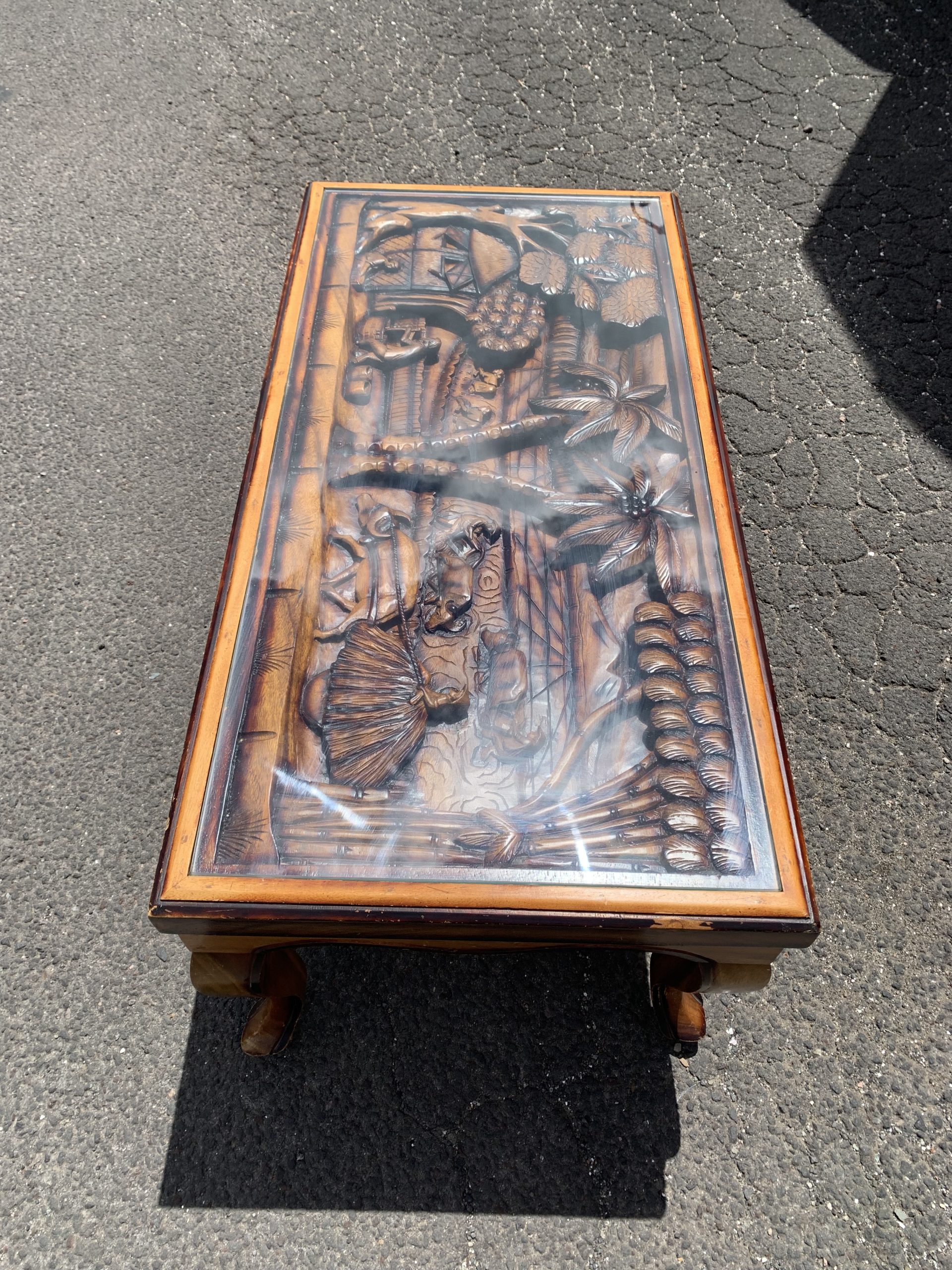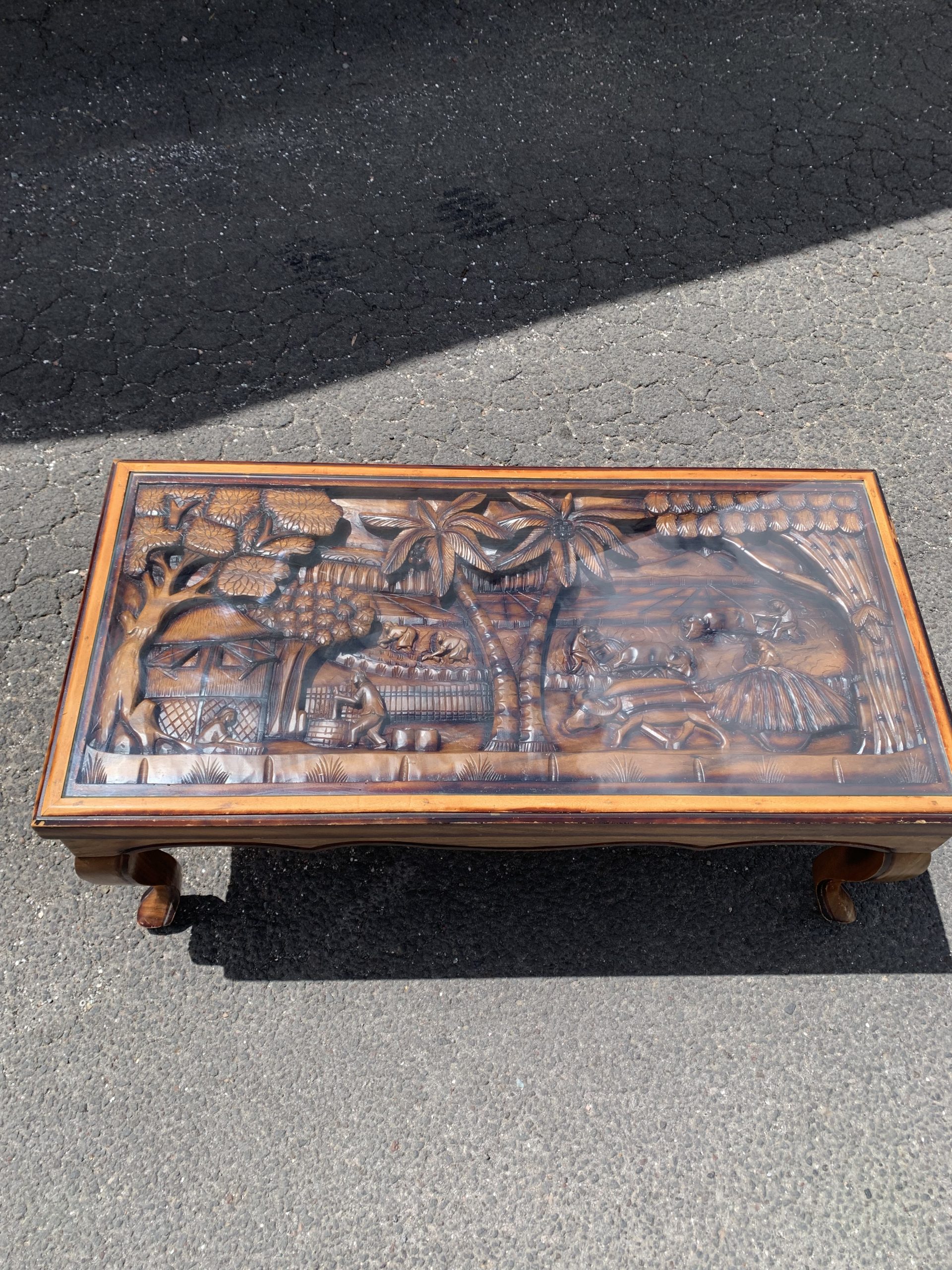 This coffee table has a rural Indonesian motif hand carved into the top covered with safety glass.