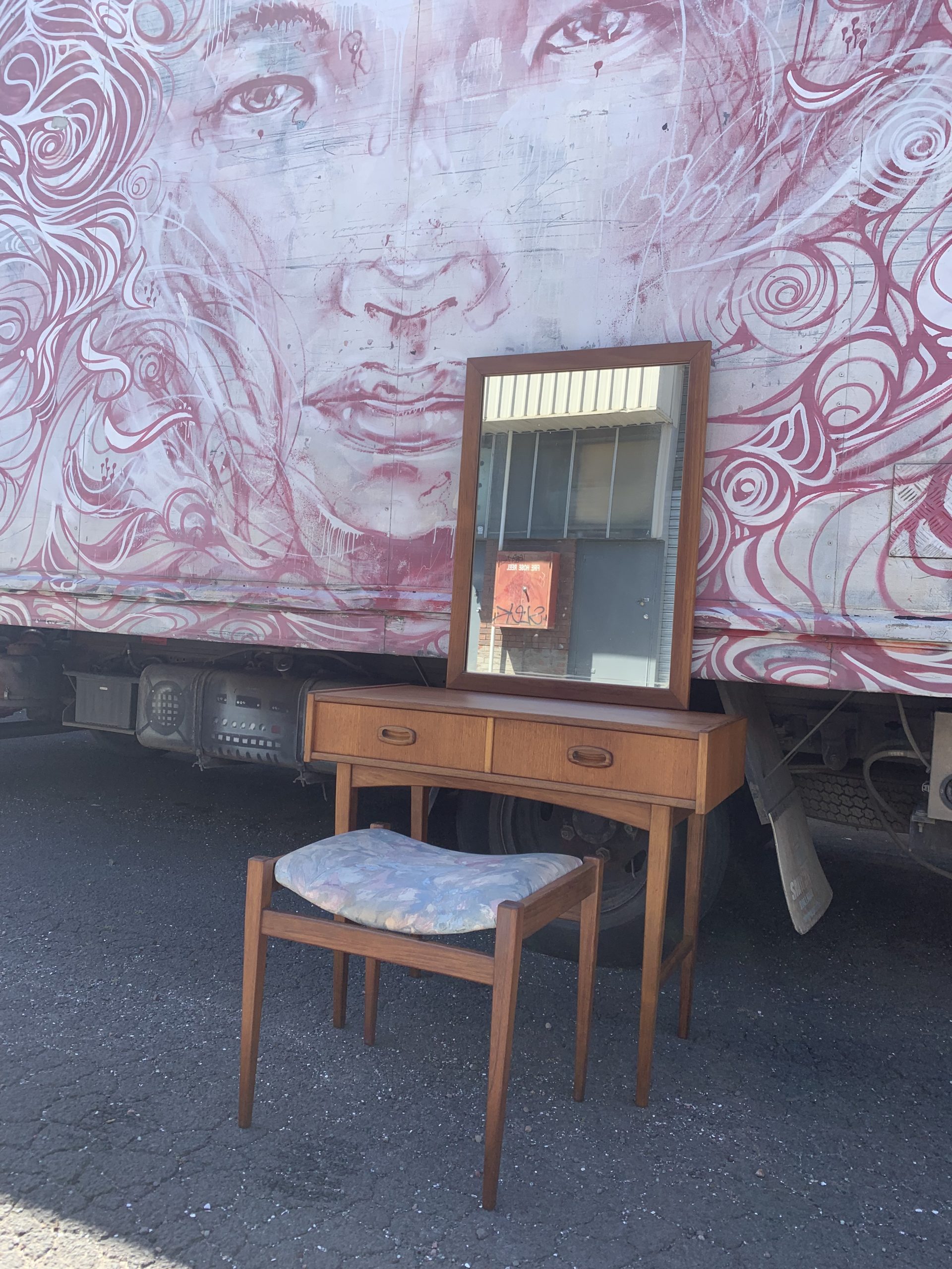 A rare iconic piece of Mid Century Modern furniture. A rare find with mirror and stool.
