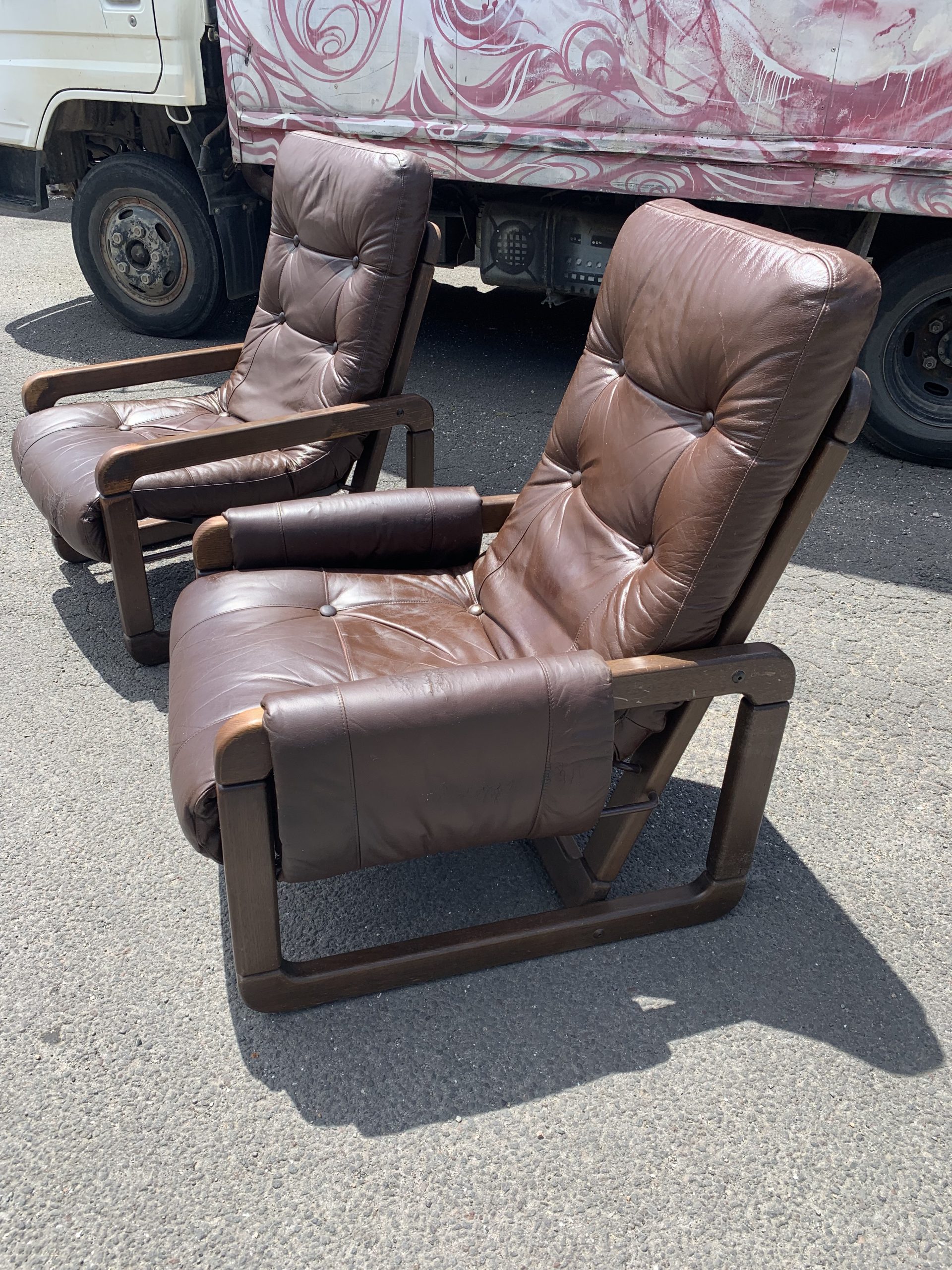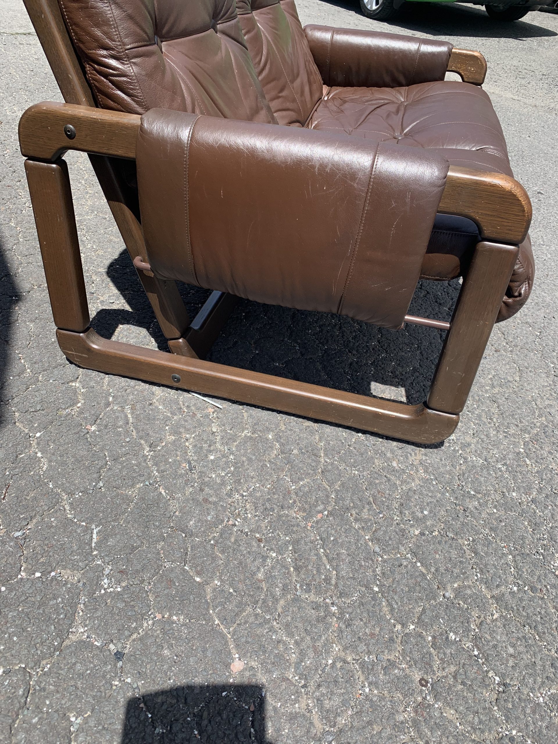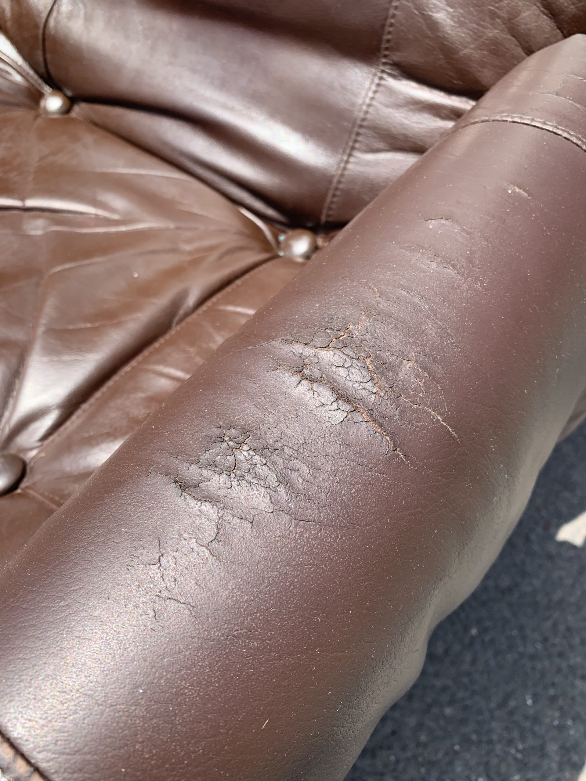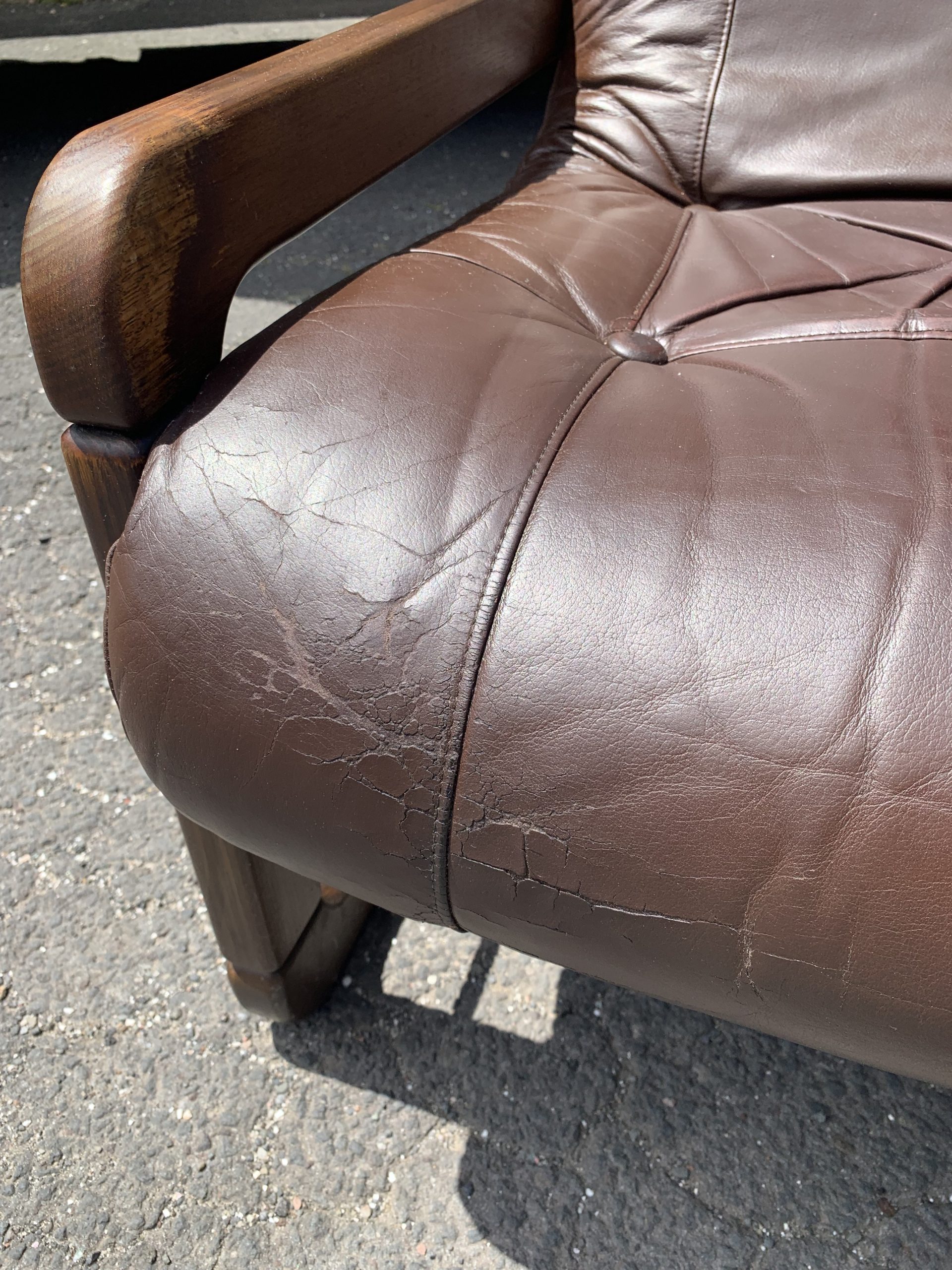Frame is solid and sturdy. Two arm cushions are missing and some wear to leather on one chair please see photos.