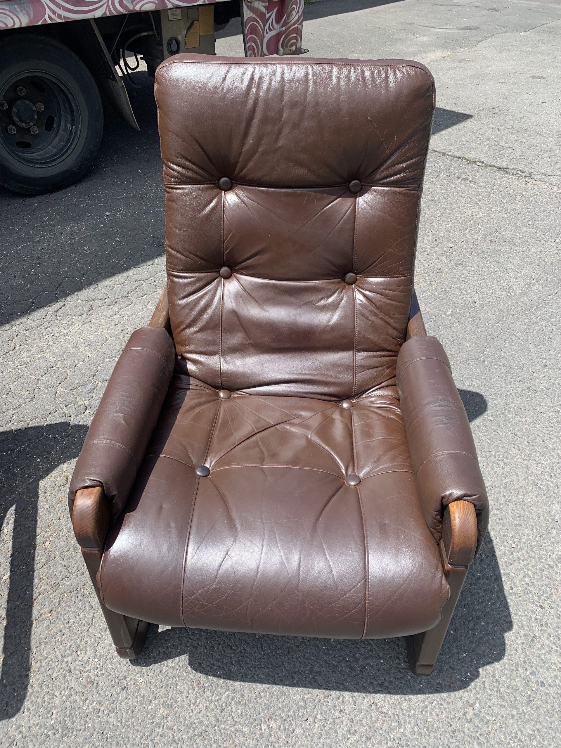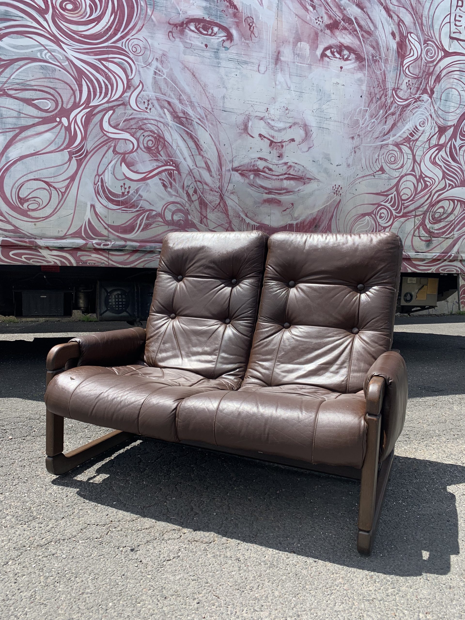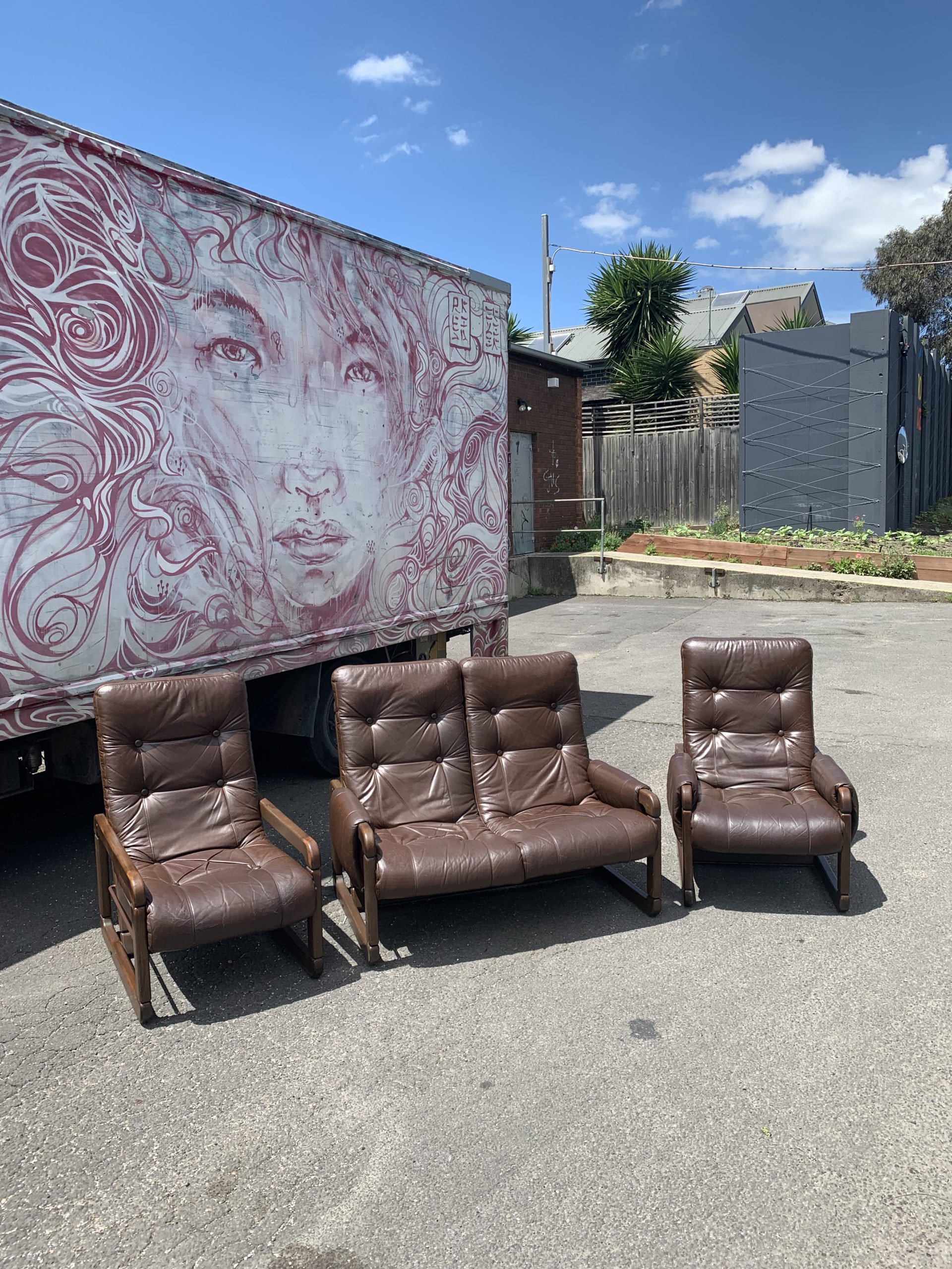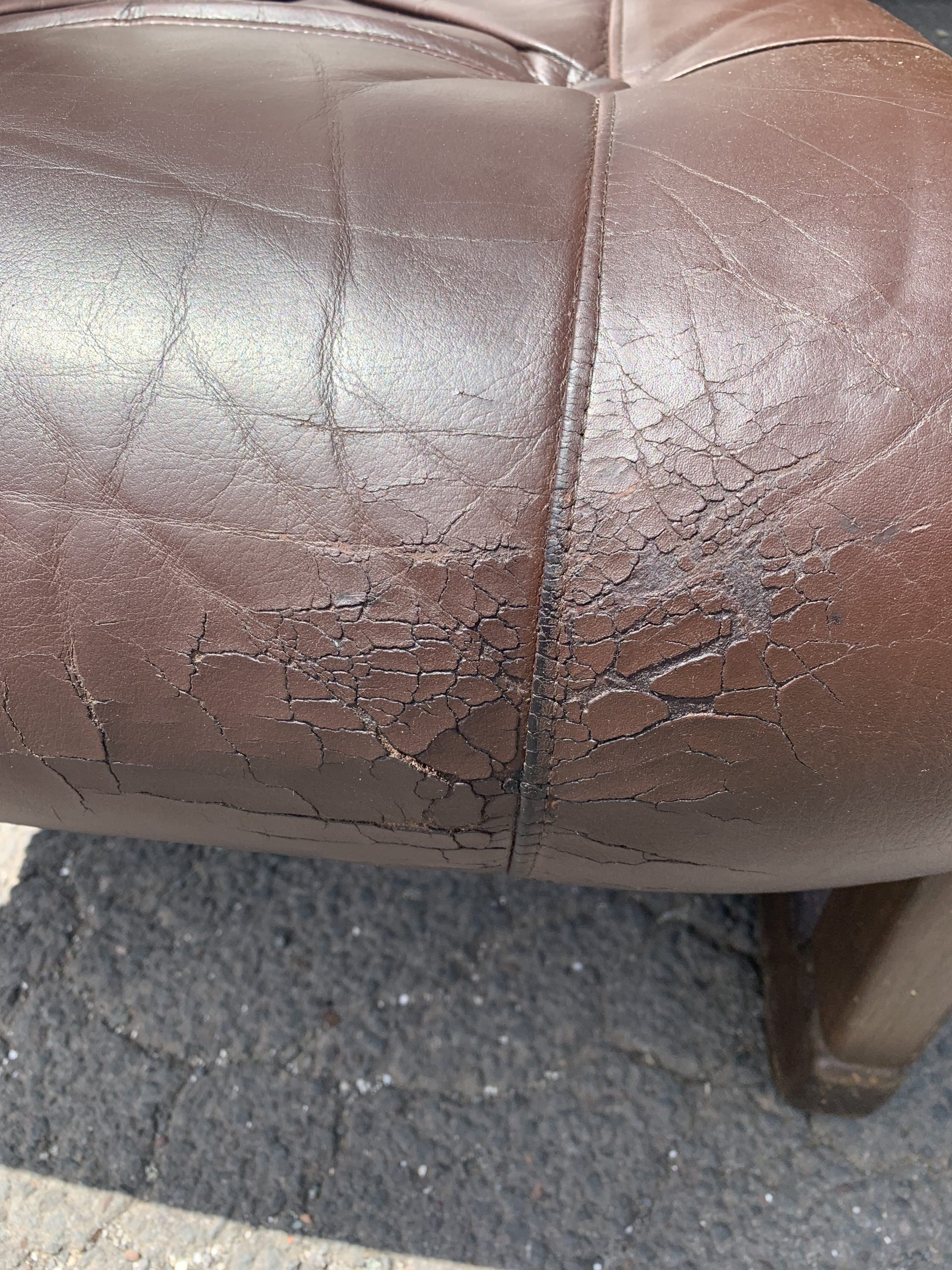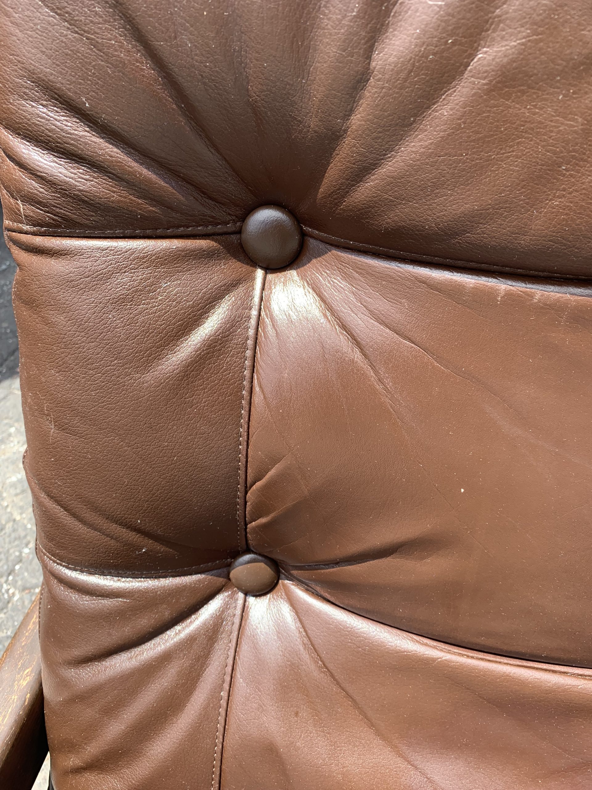 Frame is solid and sturdy. Two arm cushions are missing and some wear to leather on one chair please see photos.
